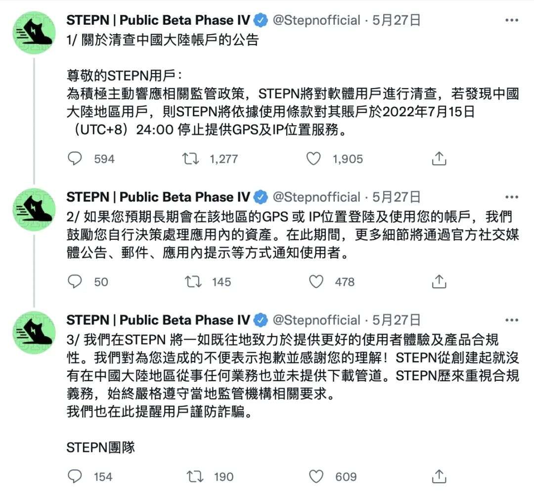 STEPN 官方发布《关于清查中国大陆账户的公告》。图片来源 | STEPN twitter 账号截图