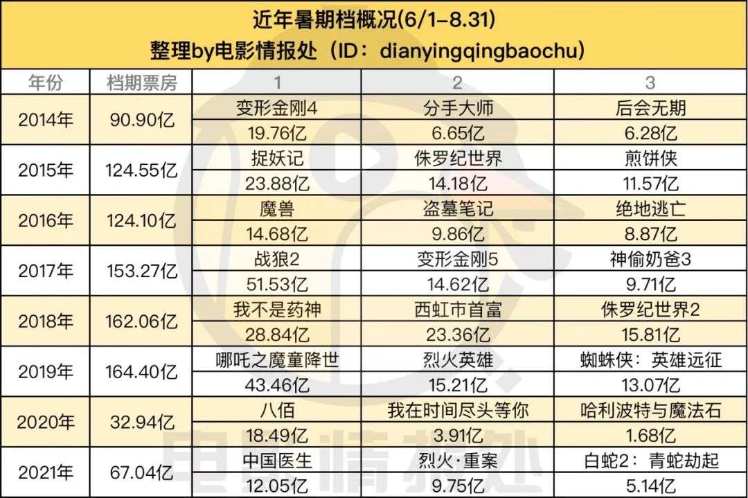 如果去掉2020-2021年这两年的暑期档,毕竟这两年疫情的影响使得暑期档并不完整,其实如果去年暑期档能有一部不错的头部影片落位,那么有更高的突破并不是妄想。