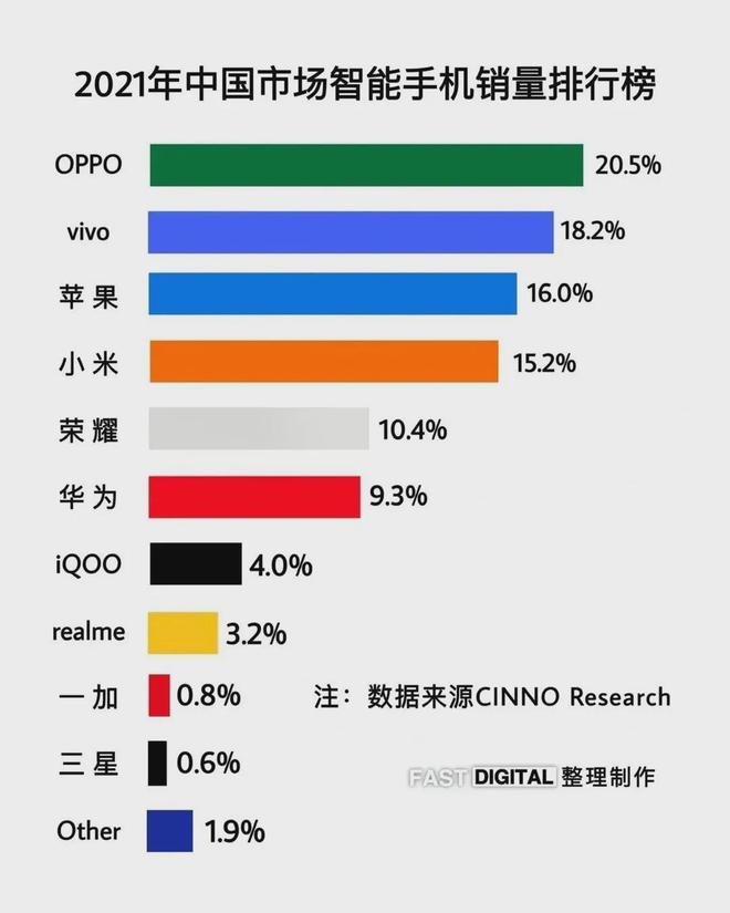以2021年的数据为例,OPPO、vivo、苹果、小米、荣耀前五强,抢占了80.3%的市场份额。
