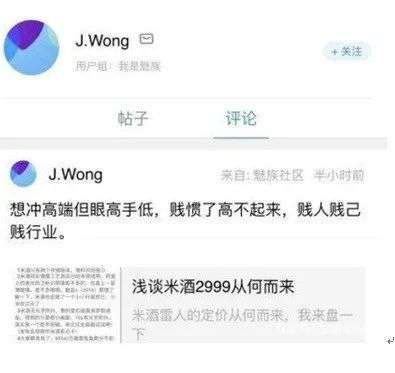 2019年2月21日,魅族老板黄章在社区发布《浅谈米酒2999从何而来》,将刚刚发布的小米9扒光,嘲讽其“想冲高端但眼高手低,贱惯了高不起来”,并怒怼雷军“贱人贱己贱行业”。