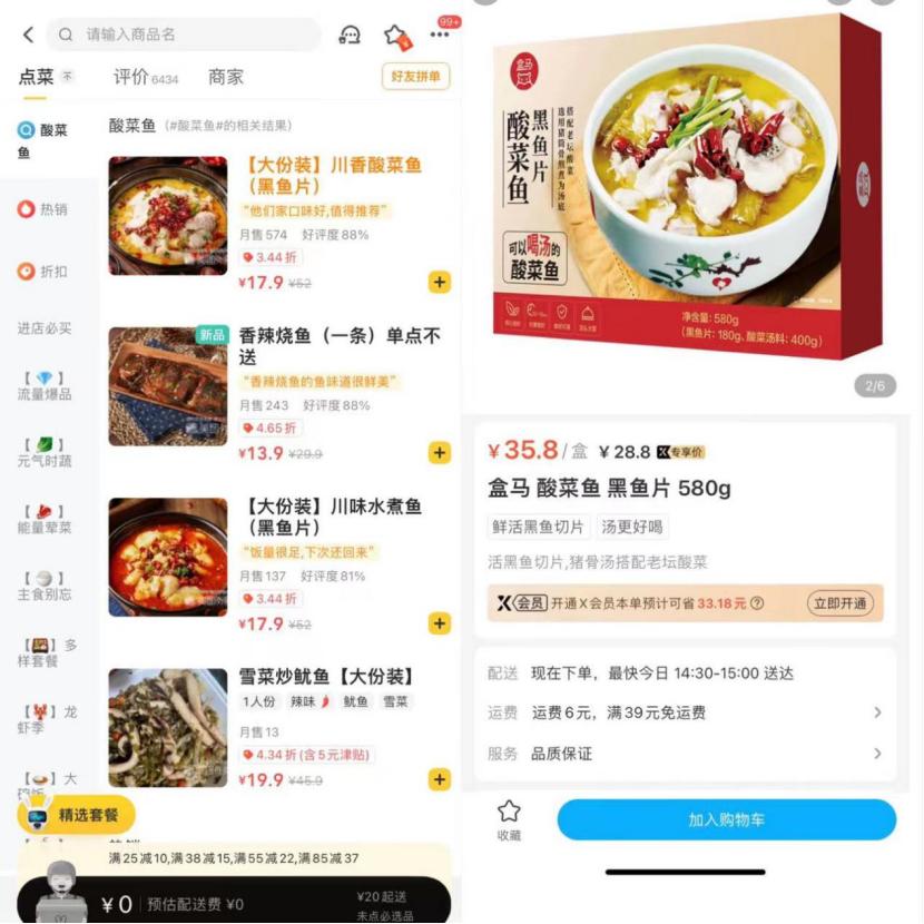 比如,以酸菜鱼为例,杭州盒马鲜生门店的预制菜产品酸菜鱼售价约36元,在外卖平台上酸菜鱼+米饭的套餐价格基本不到20元。