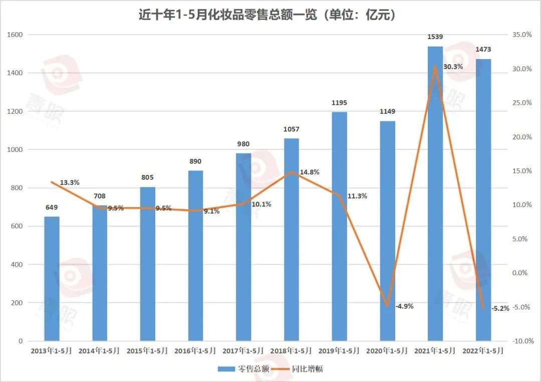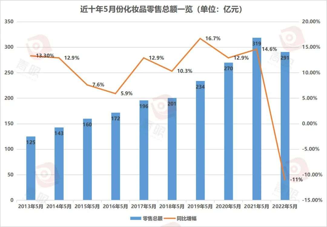 根据青眼梳理的数据显示,在2013年至2021年的九年里,历年5月的化妆品零售总额均一直保持着正向增长的势态。即便是在疫情最初期的2020年5月,也保持了12.9%的同比增长,而今年5月,化妆品零售总额却出现了11%的同比下滑。