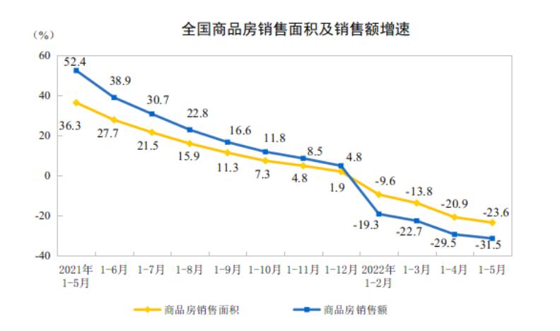 来看几组数据:据国家统计局,1-5月份,全国商品房销售面积50738万平方米,同比下降23.6%;其中,住宅销售面积下降28.1%,住宅销售额下降34.5%。