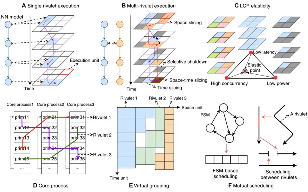 在此基础上,研究团队构建了时间和空间切片相结合的资源模型来管理多rivulet,并通过虚拟分组,以一种同步-异步混合分组的方式设计了rivulet的执行,能够支持多个独立或相互作用的rivulet。