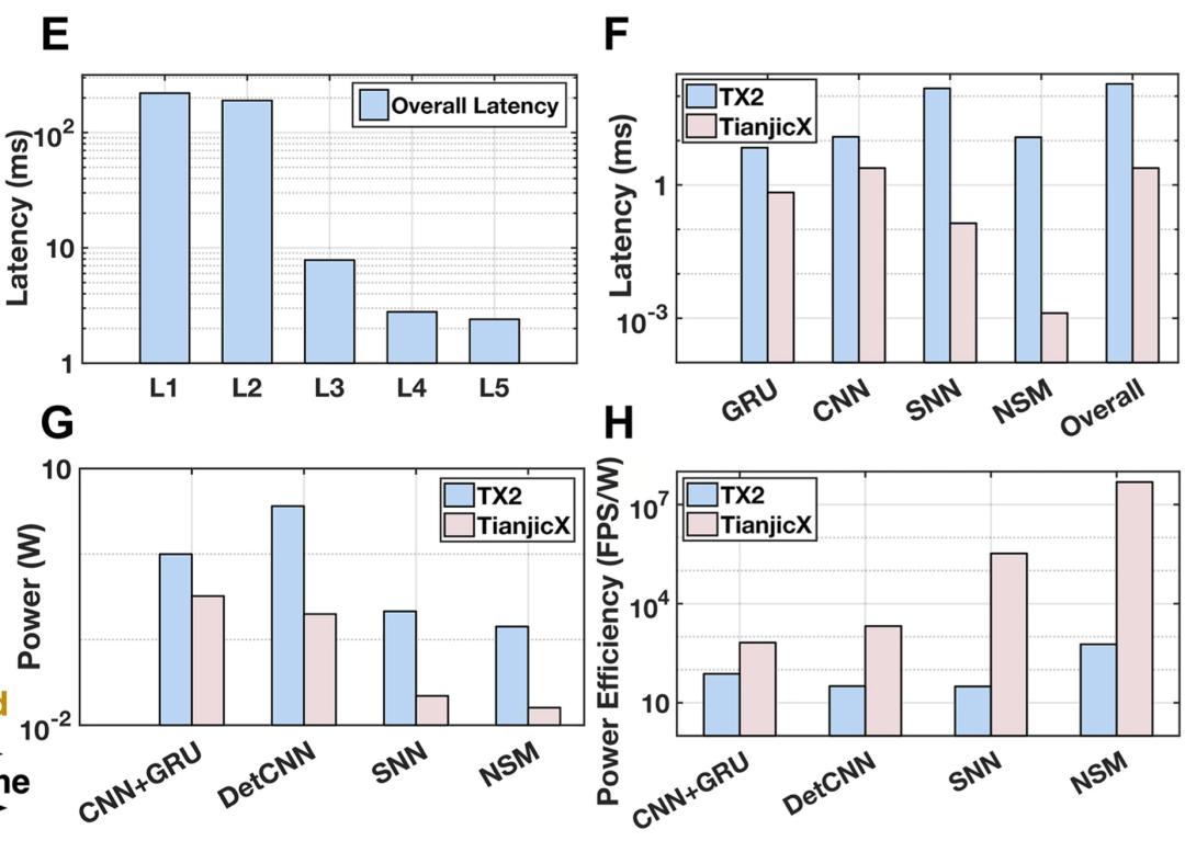 实验结果显示,与NVIDIA Jetson TX2相比,在TianjicX上跑多个网络的延迟大幅减少了约98.74%,动态功率降低了50.66%。
