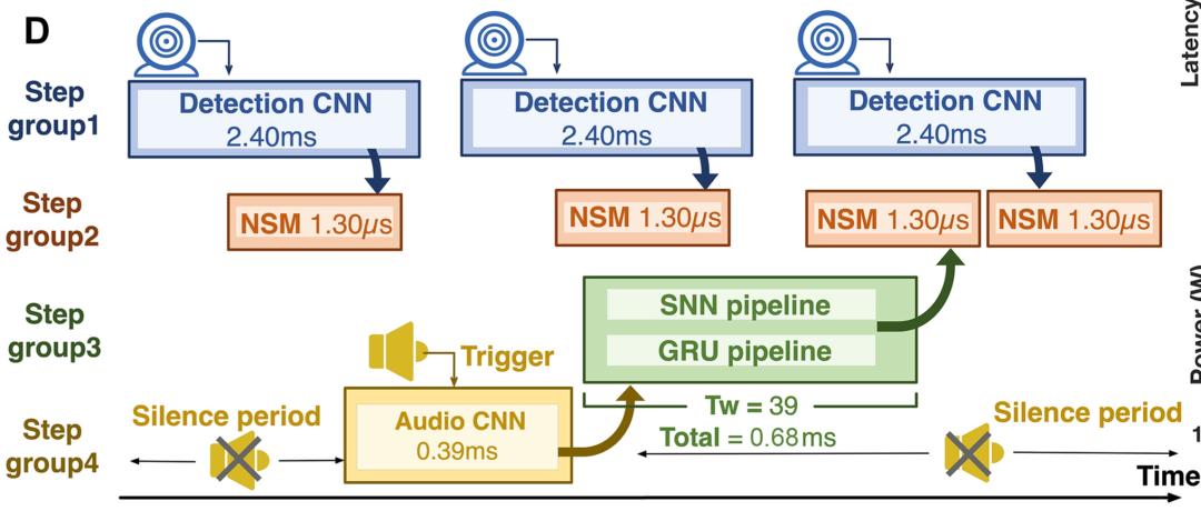 这项工作里,轻量级检测卷积神经网络(CNN)被用于端到端多目标检测,SNN充当声音处理神经网络的事件驱动开关,CNN-GRU(门控循环单元)混合网络被用于估计声源位置,基于SNN的神经状态机(NSM)被用于进行多网络调度和策略决策。