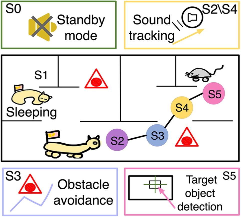这只“机器猫”需要通过视觉识别、声音跟踪或两者结合的方式来追踪老鼠,然后在不与障碍物碰撞的情况下向老鼠移动,最终追上它。