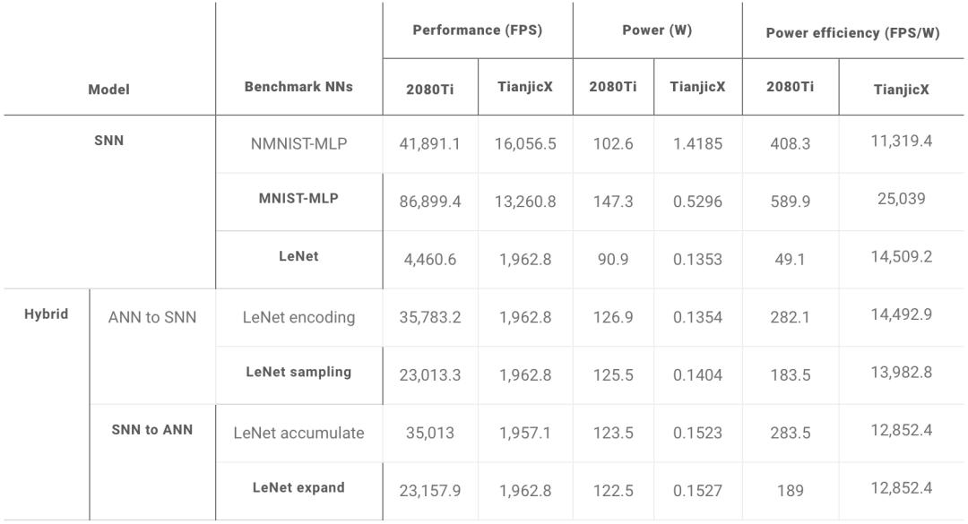 其实验结果展现了TianjicX支持大规模人工神经网络、SNN和混合脉冲/非脉冲模型的潜力。
