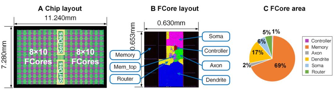 该芯片包括160个FCore和1个用于芯片间通信的高速序列化/反序列化(SerDes)接口。控制器只占用FCore大约1%的面积,但显著提高了任务执行和交互的灵活性和效率。核心内存模块由5个静态随机访问内存(SRAM)块组成,总容量为144千字节。通过高位宽并行读写接入接口,整个芯片在400MHz时钟频率下内存接入带宽可达5.12tb/s。