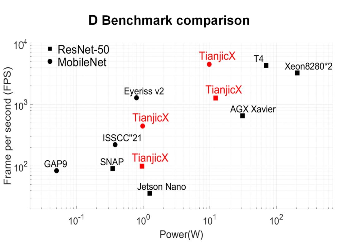 可以看到,TianjicX在中等功耗的情况下为MobileNet实现了高速的图像处理,可见其在边缘应用中具有竞争力。此外,TianjicX还能在低功耗的情况下处理ResNet50。