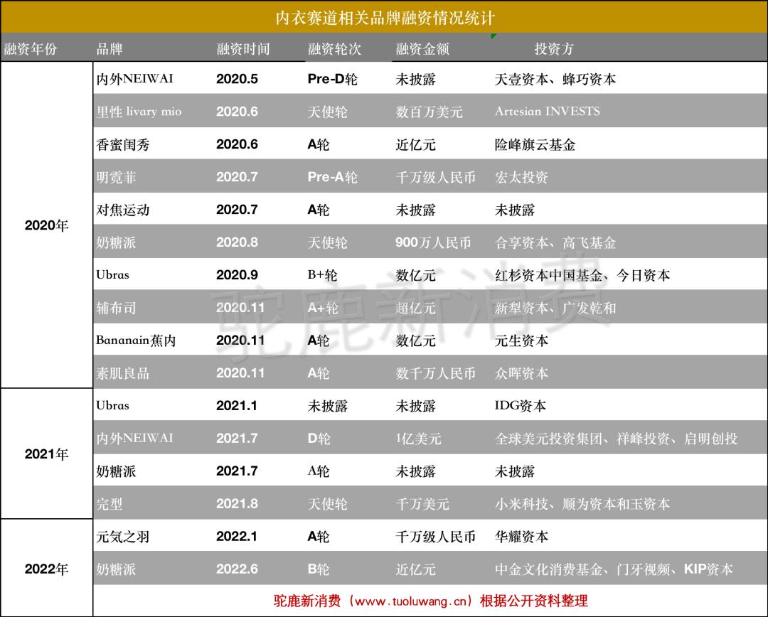 据驼鹿新消费不完全统计,最近三年,国内内衣赛道共发生16起融资事件,从已披露的融资金额来看,几乎每起都动辄千万。在资本的推动和精准的营销下,众多新锐品牌在消费市场破圈而出,如Ubras、内外、奶糖派等。