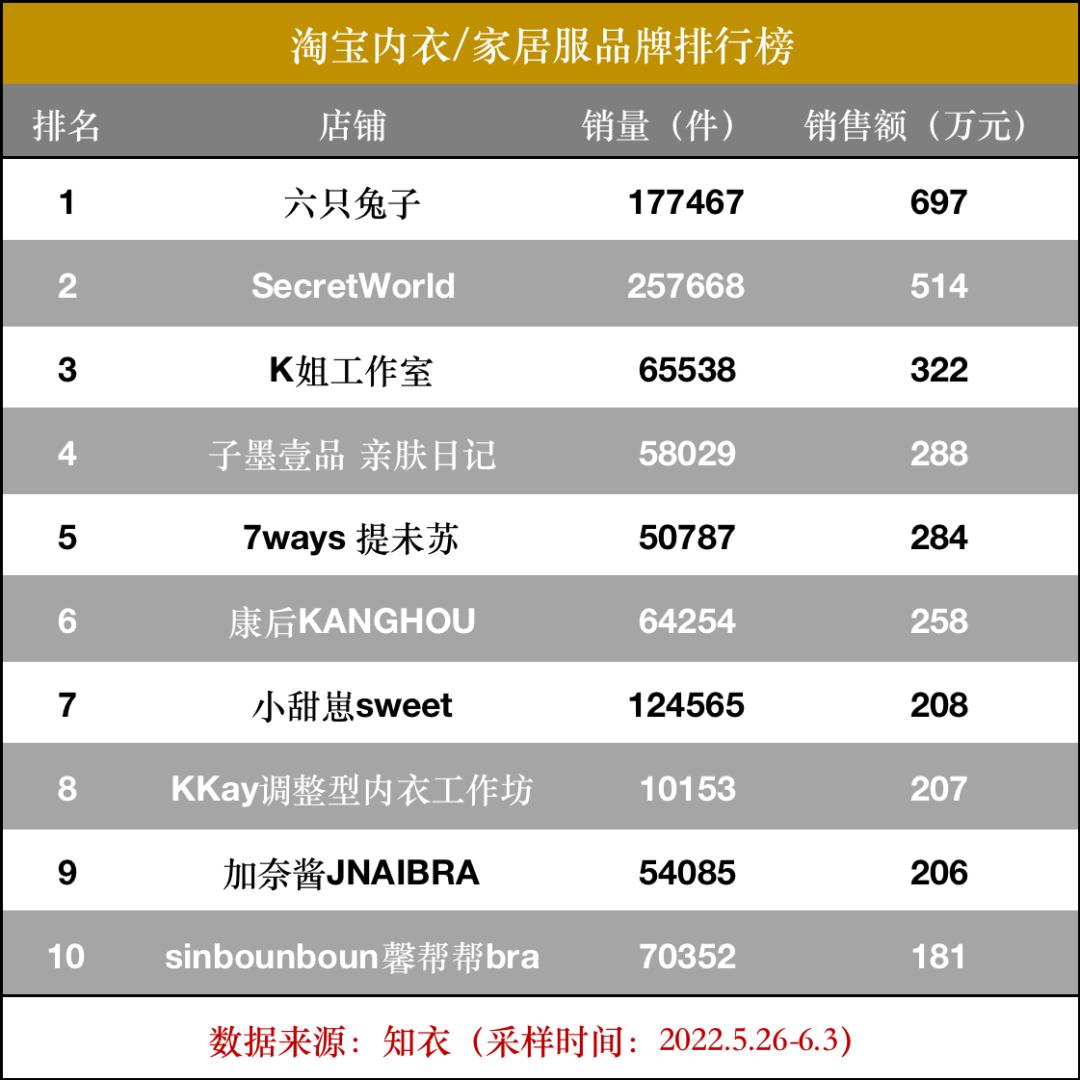 根据知衣统计的淘宝618预售榜单,淘宝店铺的内衣/家居服品牌前十名的销售额在181万元之697万元之间,虽然与大品牌相差甚远,但对于低成本的店铺来说的确算得上是一门好生意。