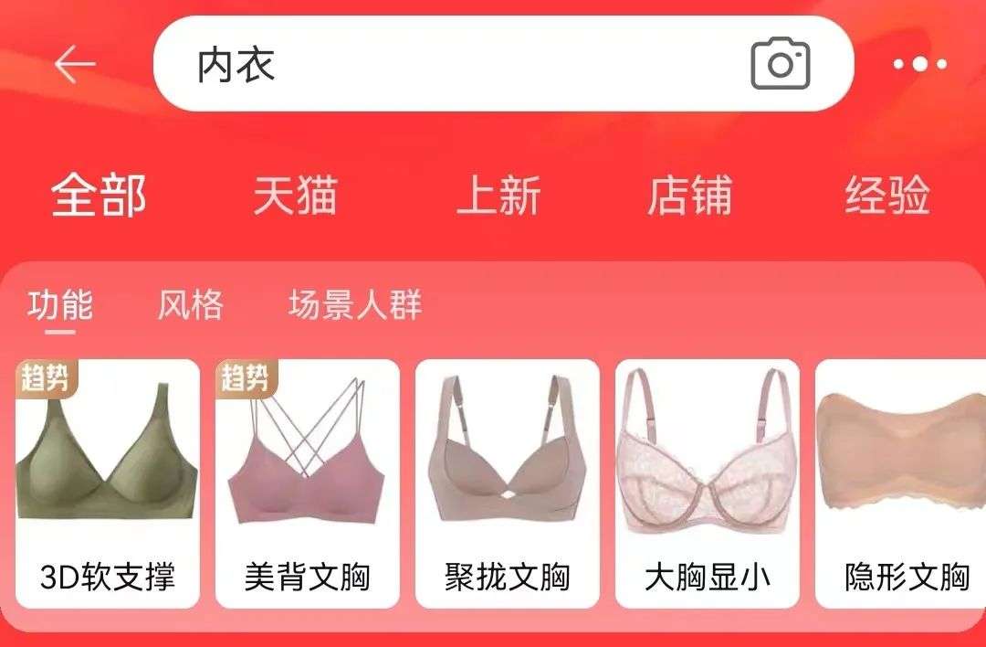 打开淘宝搜索内衣,莫兰迪配色占据了大半个页面,而让品牌兴奋推广的新品类和产品卖点,几乎每个店铺都有相应满足条件的同款,而在基本款式固定的条件下,细微的改动带给消费者的体验并不明显,更别提成为消费者心中的独一无二。