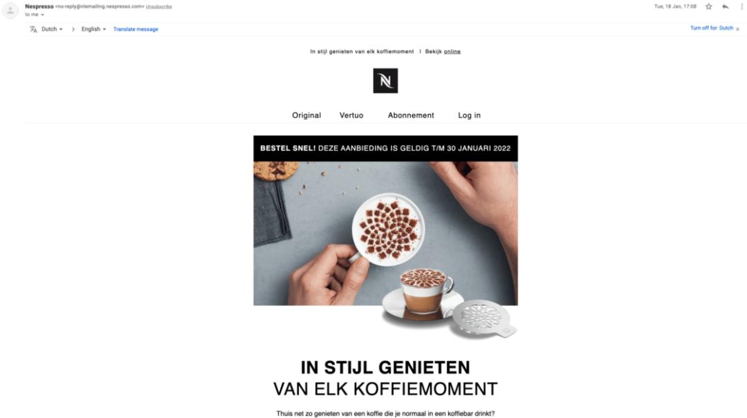 Newsletter 在不少人的日常生活中并不少见。仅从形式上,通过邮件形式分发给订阅者的 Newsletter 常常包括就职单位的周期性纪要,或是品牌、超市或百货公司推送的商品或促销信息。比如下图就是我之前订阅的 Nespresso 的推广 Newsletter,我通过订阅了解他们出的新款咖啡口味,或者打折信息等等。