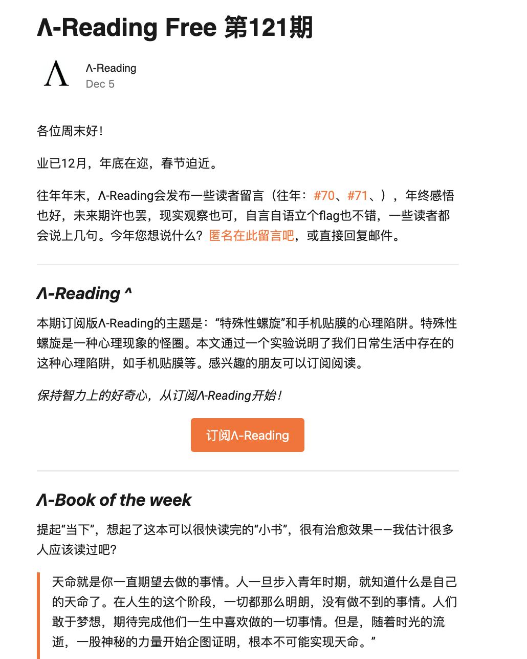 主题式阅读是很多人喜欢并推荐的阅读方式。同一主题或相关主题的书籍、文章等集中阅读更利于我们加深对某个问题或事件的理解和思考。对于创作者来说,Newsletter 是一个很好地集中推送某一主题相关内容的方式,可以包含不同的呈现形式,比如文章、视频、播客等,也可以包括看问题的多个角度。