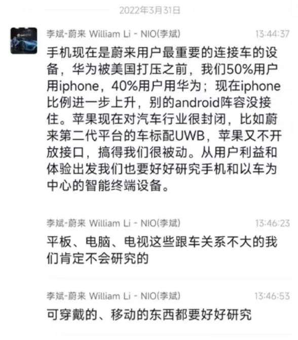 李斌说,蔚来研究手机的初心很简单——因为苹果对汽车行业很封闭,比如蔚来第二代平台的车标配UWB(Ultra Wide Band超宽带,一种无线载波通信技术),苹果并不开放接口,导致蔚来无法达成想要的用户体验。