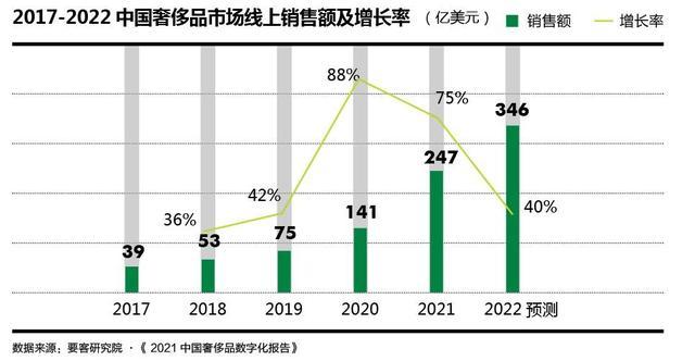根据要客研究院发布《2021中国奢侈品数字化报告》显示,2021年,中国奢侈品行业线上销售额对比2020年有爆发性增长,增长幅度高达75%,达到了247亿美元,线上销售额已经占到整个中国奢侈品销售额的26%。