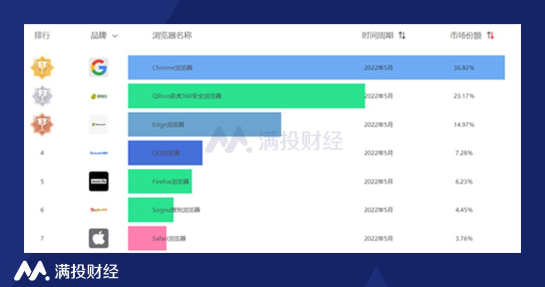 根据统计网站statcounter发布的桌面浏览器市占率排行榜中国榜,截至2022年5月份,前七名分别是谷歌浏览器(Chrome),360浏览器,微软浏览器(Microsoft Edge),QQ浏览器,火狐浏览器(Firefox),搜狗高速浏览器,以及苹果的Safari浏览器。