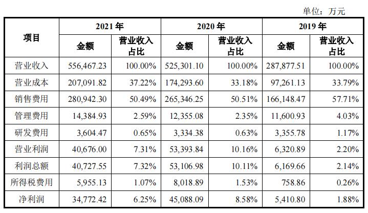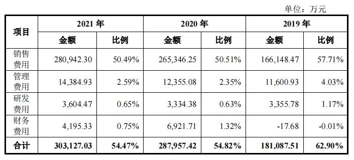 其中,公司销售费用分别为 16.61亿元、26.53亿元及28.09亿元,占营业收入的比分别为57.71%和50.51%及50.49%,2021年较2019年下降了7.22%。