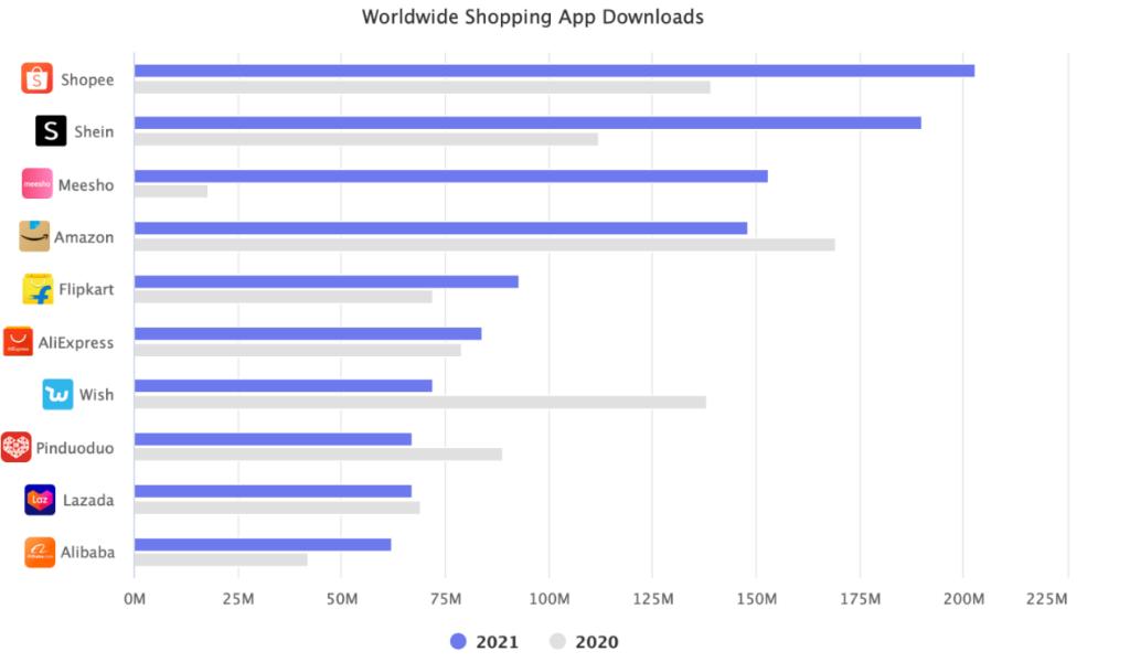 据Marketplace Pulse,Shein在2021年成为全球第二受欢迎的购物应用程序,目前是美国下载量最大的应用程序,超过了TikTok,Instagram和Twitter等巨头,远远领先于亚马逊。