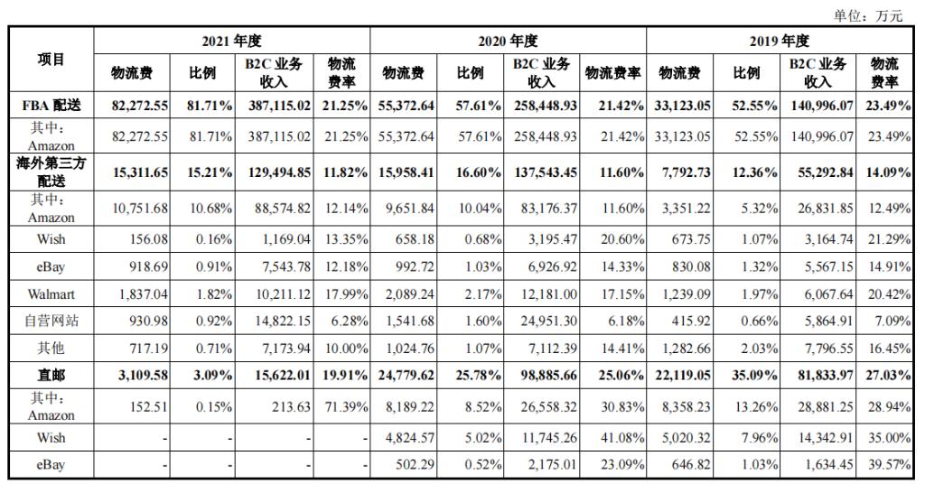 赛维时代配送分为FBA配送(由亚马逊代为配送)、海外第三方配送和国内直邮。其中,FBA配送和海外第三方配送占比较大,招股书数据显示两者的物流费率近年来成下降趋势。