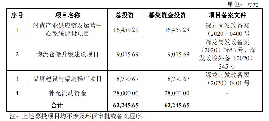 本次拟公开发行不超过4010万股A股普通股股票,募集资金全部用于公司时尚产业供应链及运营中心系统建设、物流仓储升级、品牌建设与渠道推广等主营业务及相关项目。