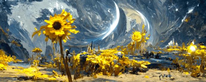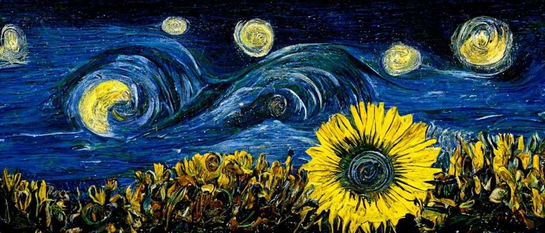 我给 AI 写的描述词:“A beautiful painting of a starry night, shining its light across a sunflower sea by James Gurney, Trending on artstation.”