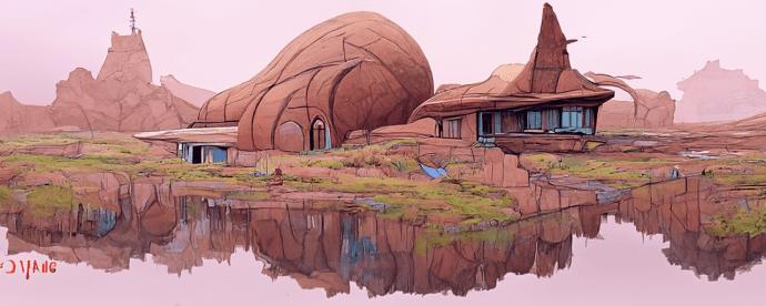 用 AI 画一个莫比斯风格的场景:“a beautiful painting of a spaceship flying over a desert by Moebius, trending on artstation.”
