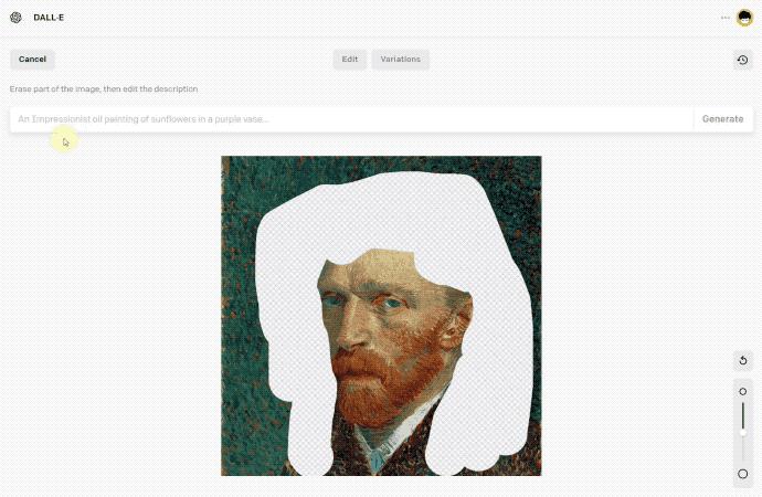 毫不夸张地说,这是我目前用过体验最好的 AI 绘图工具,操作足够简单,完成度高,速度快到可以当搜索引擎:不到一分钟生成 10 张图片(1024 × 1024),可无限延伸变化,甚至可以擦除局部重新生成。你可以不停地给梵高“理发”。