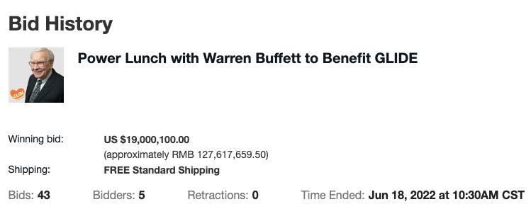 北京时间6月18日10点30分,最后一次巴菲特午餐拍卖在ebay结束,5位竞拍人经过5天43轮出价,一位匿名者最终以1900万美元(约合1.28亿元人民币)的历史最高价竞拍成功。