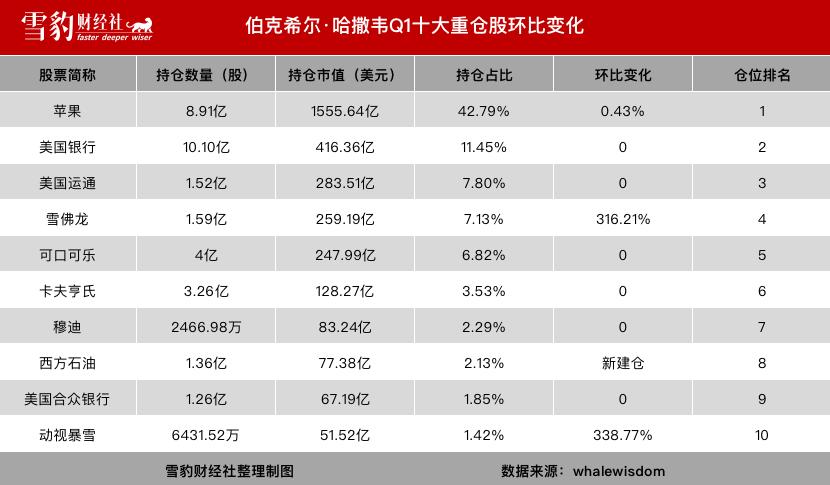据伯克希尔·哈撒韦向美国SEC提交的13F持仓文件,2022年一季度,公司持仓总市值达到3635.54亿美元,环比增加9.85%,十大重仓股合计占比87.20%。其中,头号重仓股苹果已持有6年,美国运通、可口可乐、穆迪则持有21年。