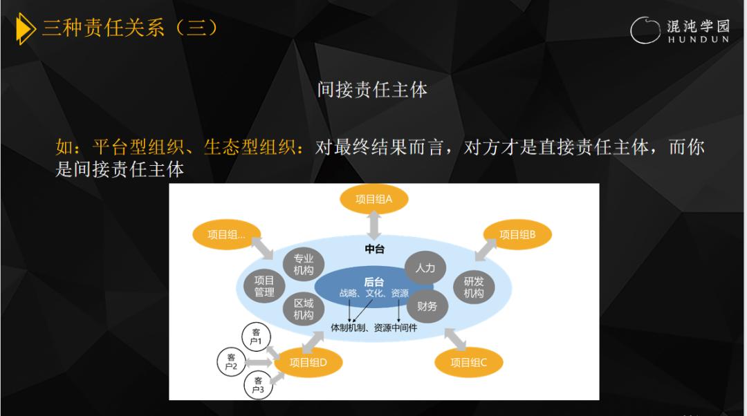 要么是间接责任主体,比如你想做一个平台型的组织、生态型的组织,对生态圈中的企业,你投资不控股,帮忙不添乱,其实就做成了间接主体的关系。对最终结果而言,你投资的那家公司才是直接的责任主体,而打造生态型组织的你,是一个间接责任主体。