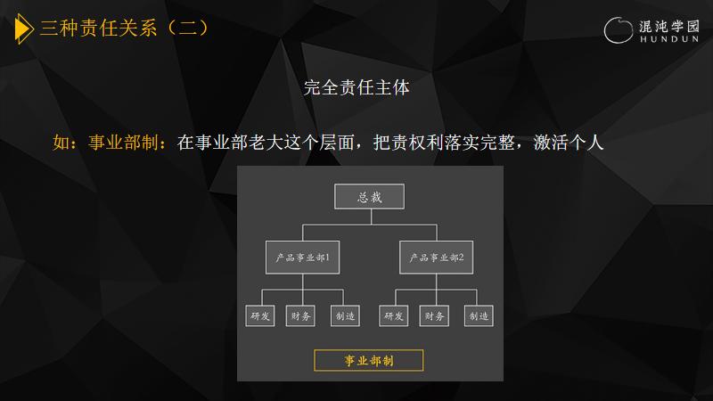 要么是完全责任主体,比如事业部制,就整个事业部而言,它麻雀虽小,但五脏俱全,至少在事业部老大这个层面,要把责权落实完整,把这个人彻底激活,要找他拿结果。事业部老大就是这个事业部的完全责任主体。