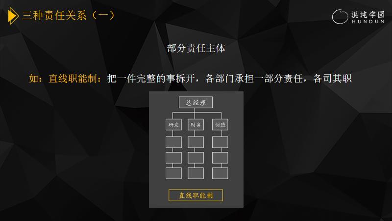 要么是部分责任主体,比如公司是直线职能制的,把一件完整的事拆开,各部门各司其职,各自分担责任,最终把公司要做的事做成。横向是专业化分工,纵向是层级分工,有人负责拿策略,有人负责做执行。