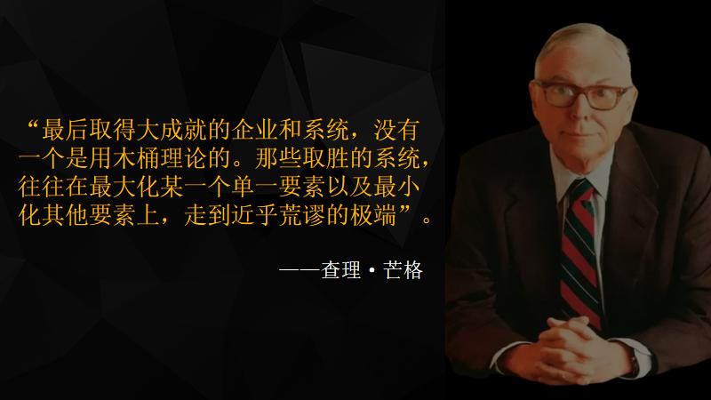 我很欣赏查理·芒格先生的一个观点,据他观察,能取得大成就的企业和系统,没有用木桶理论的。那些取胜的系统往往是在最大化某个单一要素上走到了近乎荒谬的极端。我多年前写过一个看法,即成功的战略定位之所以能带来利润,是因为商业模式内部的运转结构足够逻辑自洽,足够严丝合缝,其各组成部分之间发挥出了互补相乘的效果,形成了一张密不透风的网,不给竞争对手留余地。这是战略和组织管理的紧密配衬。