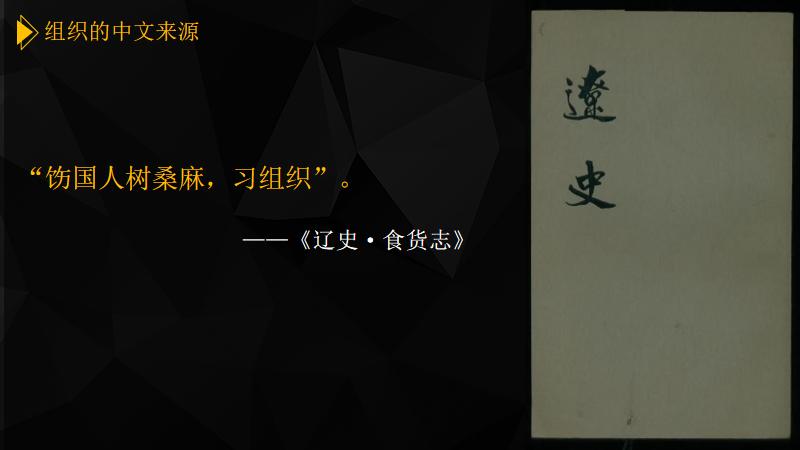 组织的中文最早出现在《辽史》食货志,“饬国人树桑麻,习组织”。饬是整饬的饬,安排的意思,是指安排这个国家的人民去种桑树,种完桑树之后养蚕取蚕丝,种麻,然后来做纺织、编织。从语词学的意义来讲,所谓的组织最早就是编织。