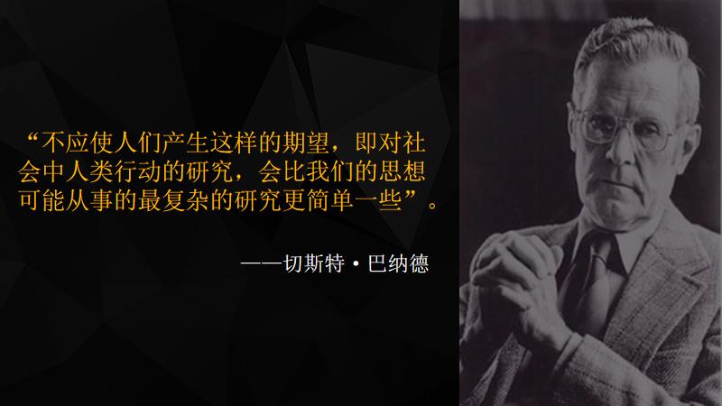 组织这个话题非常大。借用我尊敬的组织理论奠基人切斯特·巴纳德先生的话说,我们“不应使人们产生这样的期望,即对社会中人类行动的研究,会比我们的思想可能从事的最复杂的研究更简单一些”。但我又非常希望给大家一个极简的框架,以使我们能纲举目张地把握其中要害。这个极简框架的一级目录只有三个最基本的要素——竞争力、组织机制、责任到人。