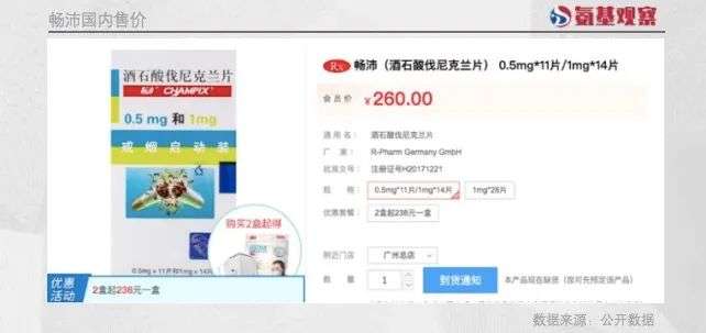 以国内为例。如下图所示,Champix0.5毫克*11片/1毫克*14片的产品组合为260元,1毫克*28片的产品为345元/盒。