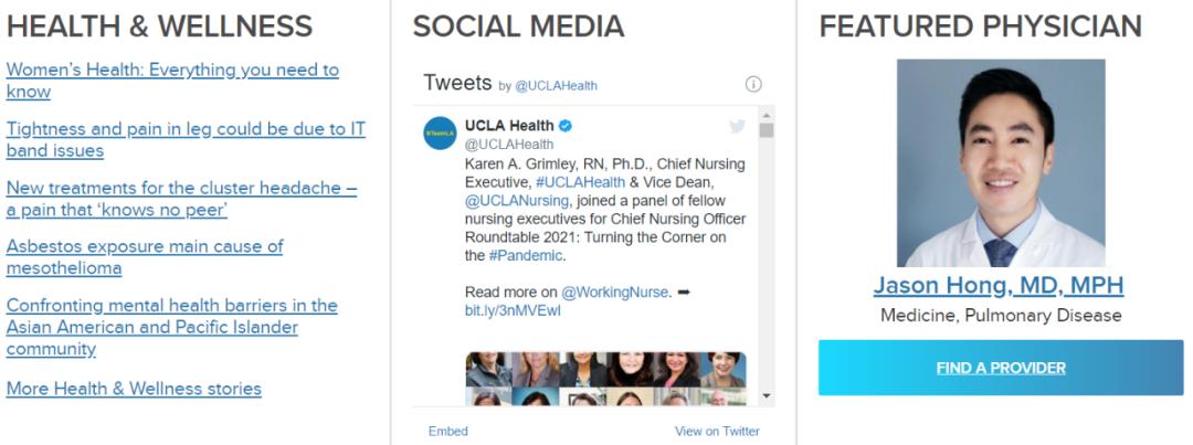 我国某三甲医院官网的宣传信息,与对应档次的美国类似大学附属医院的官网宣传比较,相对来说,我国医院宣传的内容与老百姓的贴身生活较难挂钩(图源:医院官网截图)