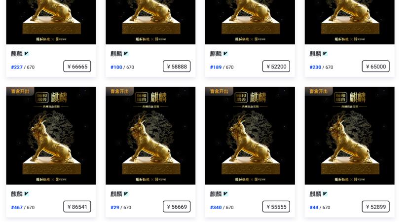 6月15日,iBox新发售的“Nonoku头像”,发售价为499元,目前二级市场价格已经在26600元左右;发售价为99元的“颐和瑞兽”系列盲盒,目前在二级市场的价格均高于4000元,盲盒珍稀度为“SSR”的“麒麟”目前在二级市场价格已不低于五万元。