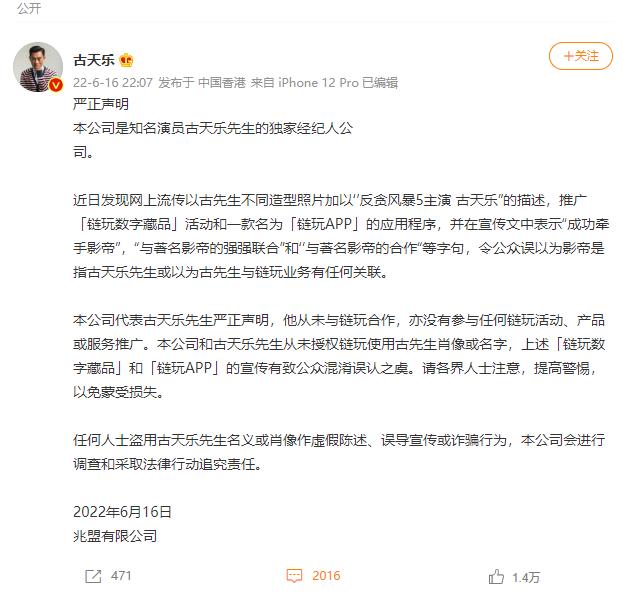 6月16日晚,古天乐经纪公司发布声明,称古天乐从未与某应用程序合作,也没有参与任何活动该项目的活动、产品或服务推广,从未授权其使用古天乐肖像或名字。