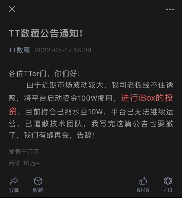 5月17日晚间,TT数藏公号发布公告称:“由于近期市场波动较大,我司老板经不住诱惑,将平台启动资金100W挪用,进行iBox的投资,目前持仓已缩水至10W,平台已无法继续运营,已遣散技术团队。我写完这篇公告也要撤了,我们有缘再会,告辞!”。