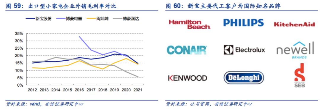 受益于小家电代工行业龙头地位,新宝股份主要代工产品以国际知名品牌为主,并且,历经多年发展,公司通过对上游塑胶、五金、压铸件、发热管等关键原料器件产业进行了整合,有着较强的成本控制能力。