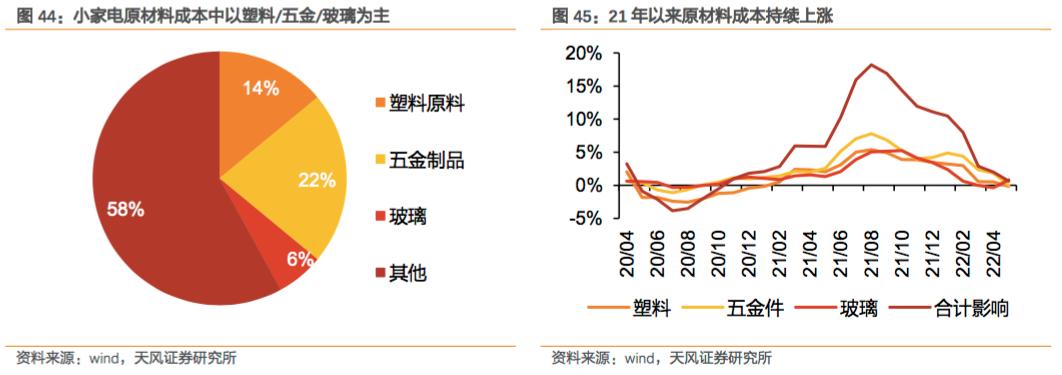 家电、小家电的生产制造,主要以PP、ABS、AS等塑料类材料,不锈钢、镀铝板等五金材料,玻璃为主,除此之外还有温控器、IC集成块、熔 断器、电线、电机等零部件。且 直接原材料约占新宝股份主营业务成本的七至八成,占比较高。