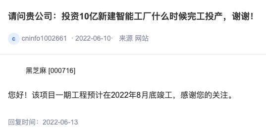 据深交所互动易显示,有投资者提问10亿新建智能工厂何时完工,黑芝麻回应为2022年8月底。
