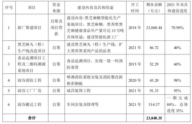 黑芝麻集团的在建工程中,新厂筹建项目工程余额达2.31亿元,占在建工程总余额 96.7%。其新厂项目始于2018年,2018年黑芝麻集团以2481万元的价格拍得广西容县的165亩土地,用于健康粮仓项目及黑芝麻糊升级智能化工厂建设。黑芝麻称,拟使用自筹资金对该智能化工厂投入不超过10亿元。