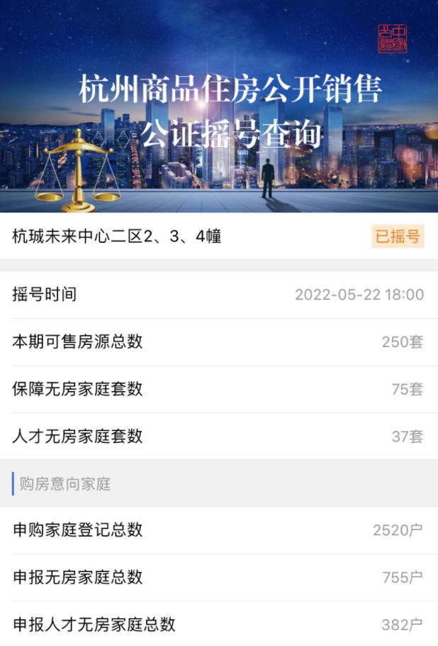 杭珹未来中心摇号情况 图源| 杭州市国立公证处官微