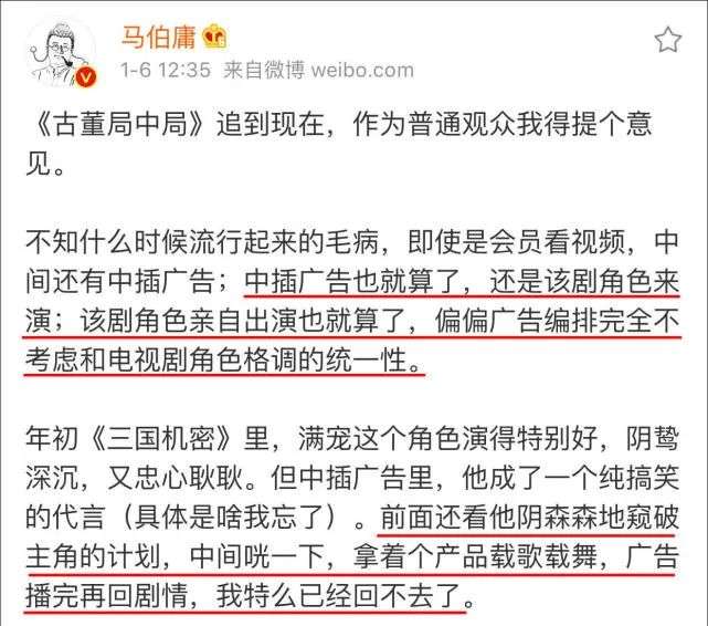 但也需要看到,2015年前后中插创意广告出现时,也曾让观众感受到新鲜感,但这种操作的创意空间有限,观众很快就失去了兴趣,2019年马伯庸甚至吐槽过《古董局中局》的中插广告,得到了不少观众响应。