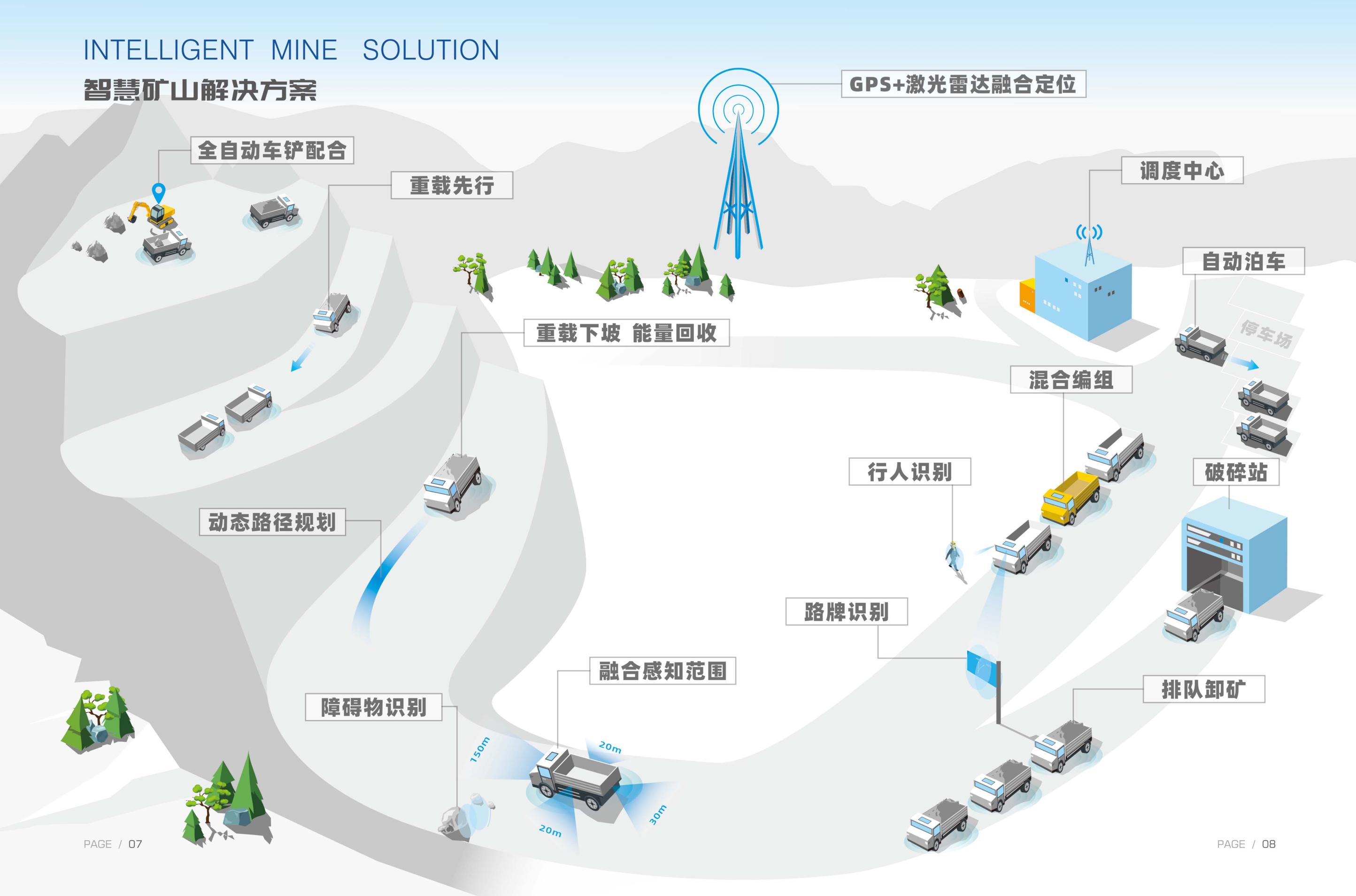 在解决了无人矿卡自动驾驶、续航等问题后,如若调度不过关,矿车工作效率还是会大打折扣。从铲矿、会车再到卸矿,一台无人矿卡完成一次工作,需要兼备自动泊车、绕行避障、自动卸矿。在矿区工作的无人矿卡依赖车与车之间的配合、路线规划,需要与其他矿卡配合,编队,行进。因此,希迪还对矿山进行整体智慧化改造,提供无人矿卡、充电桩、调度平台系统。