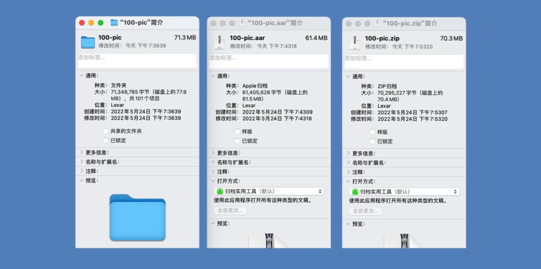 相比传统的压缩方式,使用 Apple 归档进行压缩时相比右键压缩速度更快,压缩出来的文件体积更小。这里有一张我压缩了 100 个文件的对比图。